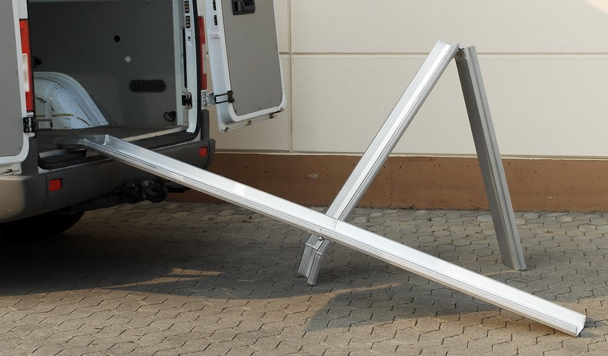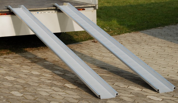 Mit den U-Schienenrampen können problemlos Höhenunterschiede überbrückt werden. Die bewährte Konstruktion bietet eine hohe Tragfähigkeit bei geringem Eigengewicht. Die Fahrfläche ist rutschsicher. Zum Transport werden die Schienen platzsparend ineinander gelegt.