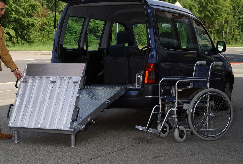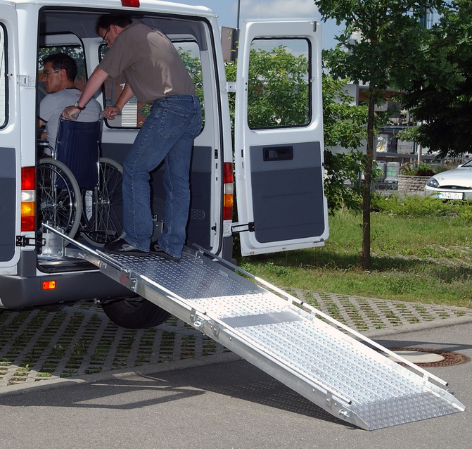 Die Rollstuhlrampe zeichnet sich besonders durch einfaches und sicheres Handling aus. Sie kann von einer Person leicht bedient werden. Druch die Verwendung von Gasdruckdämpfern ist der Kraftaufwand beim Auf- und Zuklappen angenehm gering. Die Fahrfläche ist gelocht und sehr rutschfest ausgebildet. Regenwasser oder Schnee können schnell abfließen. Während der Fahrt steht die Rampe in senkrechter Position und wird durch leicht zu lösende Verschlüsse gehalten. Intergrierte Gummidämpfer hindern Klappergeräusche.