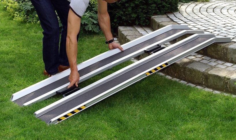 Die Aluminium-Auffahrhilfen sind aus einer hochfesten Aluminium-Legierung hergestellt. Die Fahrfläche ist mit einem rutschsicheren Korundbelag beschichtet. Die U Form sichert die Rollstühle beim Hochfahren.