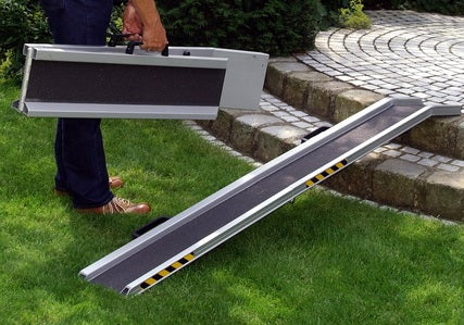 Die Aluminium-Auffahrhilfen sind aus einer hochfesten Aluminium-Legierung hergestellt. Die Fahrfläche ist mit einem rutschsicheren Korundbelag beschichtet. Die U Form sichert die Rollstühle beim Hochfahren.