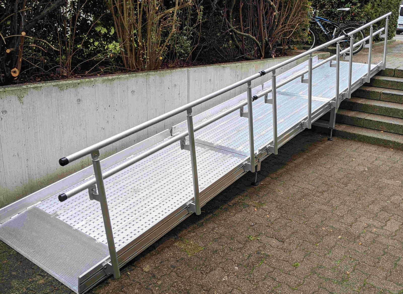 Die Rampe dient in erster Linie zum Überbrücken von Treppen und hohen Absätzen. Durch eine spezielle Stanzung der Fahrfläche wird eine hohe Rutschhemmung (R12) gewährleistet und durch die Lochung kann Regen, Schnee und Schmutz schnell entweichen. Wahlweise kann ein Geländer mitbestellt werden. Die Rampen sind geeignet für Personen, Pneus, Gummiketten und Rollstühle.