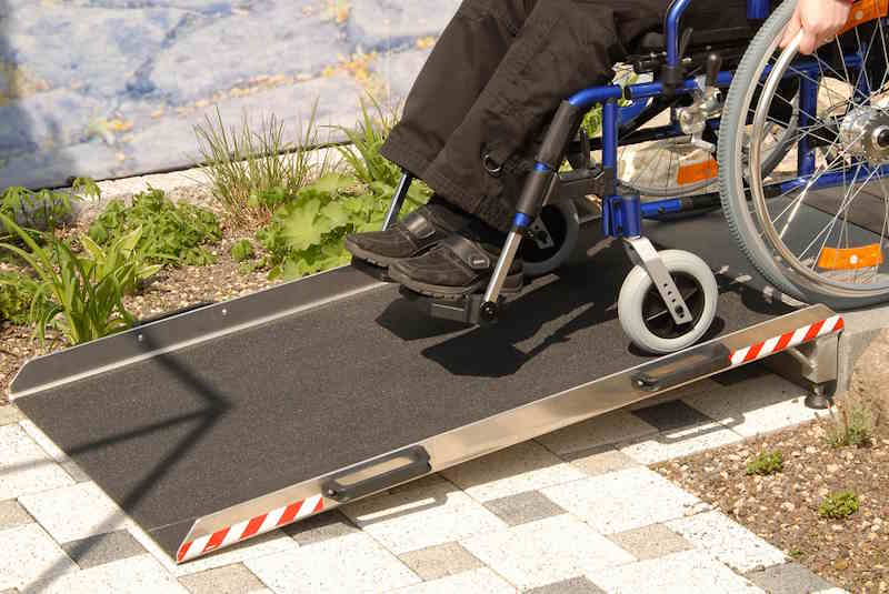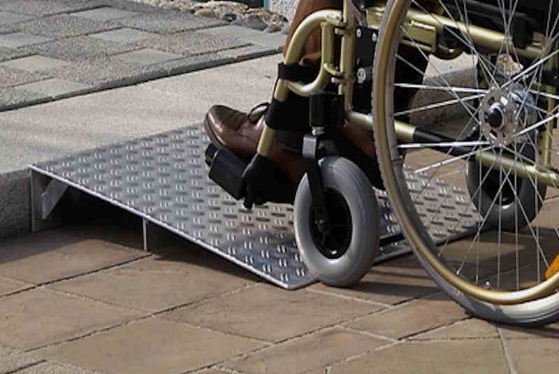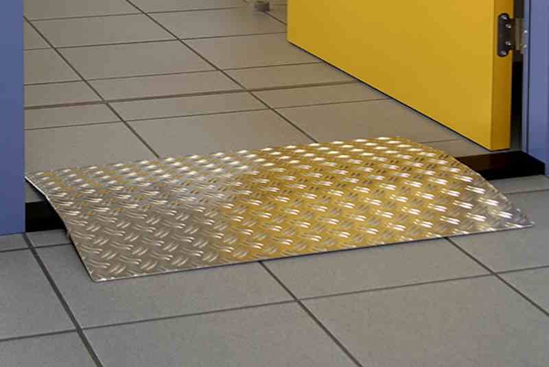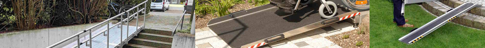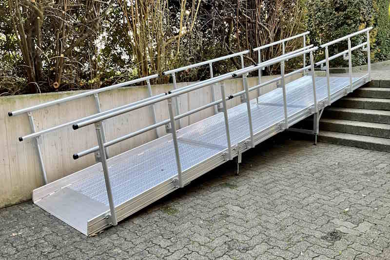 Kleine, leichte und günstige Rollstuhschiene. Die Fahrfläche ist mit einem rutschsicheren Korundbelag beschichtet. Die U-Form sichert die Rollstühle beim Hochfahren.