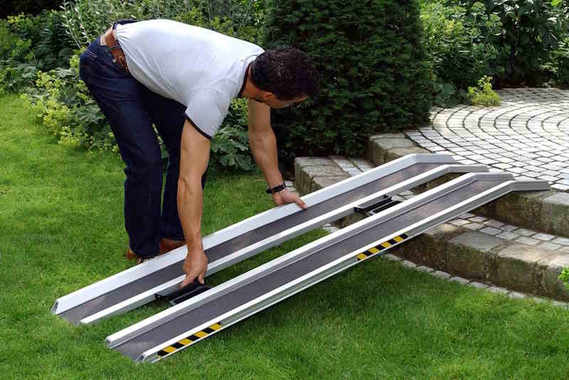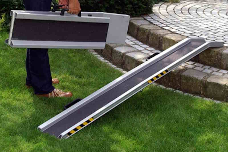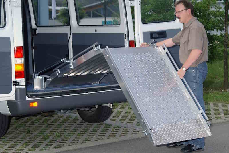 Rollstuhlschiene zum Verladen von Rollstühlen.Die Fahrfläche ist mit einem rutschsicheren Korundbelag beschichtet. Faltbarkeit garantiert kompaktheit beim Transport.