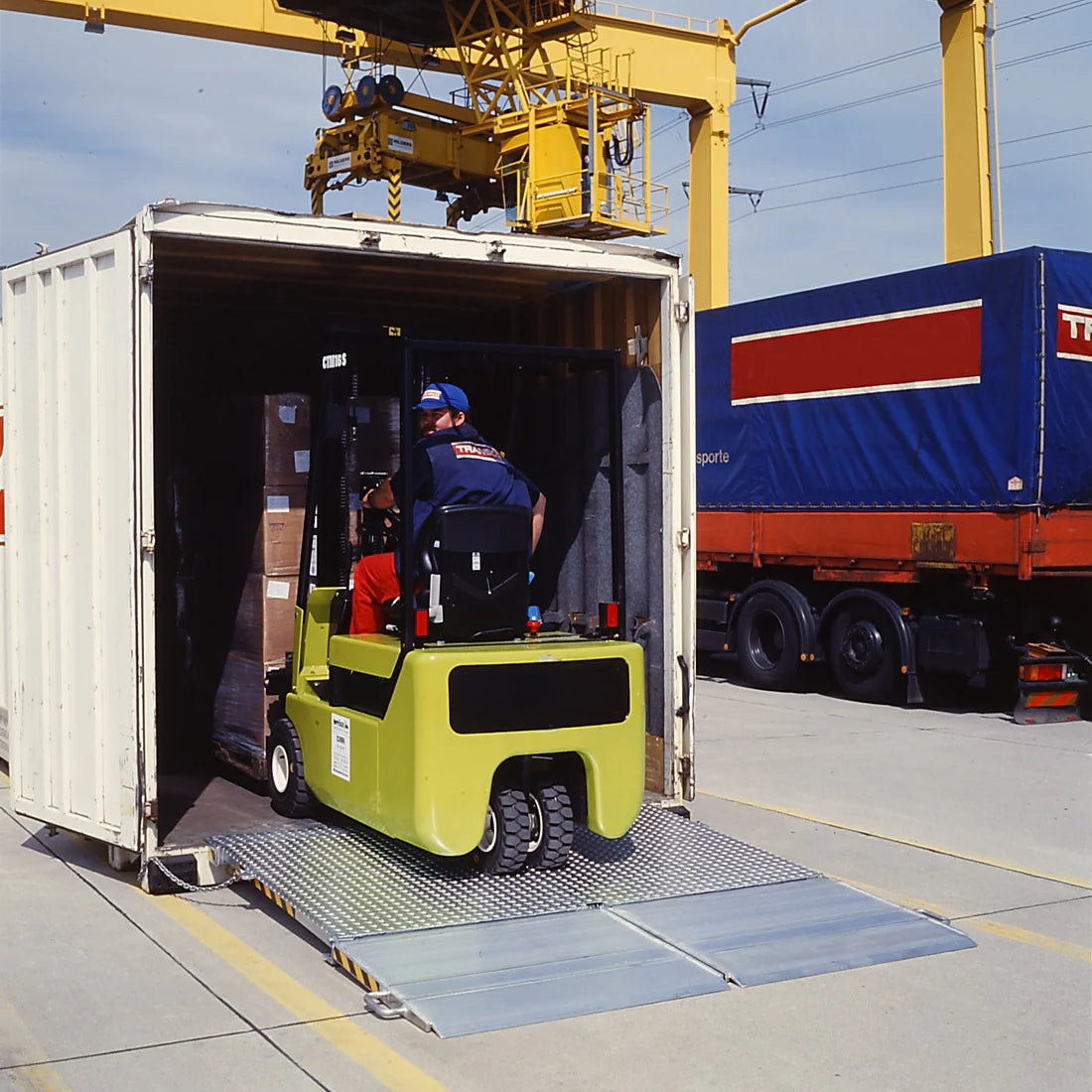 Die mobile Überladebrücke wird beim Be- und Entladen von Containern verwendet, wo Stapler mit bis zu 7.3t aus- und einfahren. Eingebaute Staplertaschen ermöglichen einen schnellen und einfachen Transport der Überladebrücke zu den entsprechenden Verladestellen.